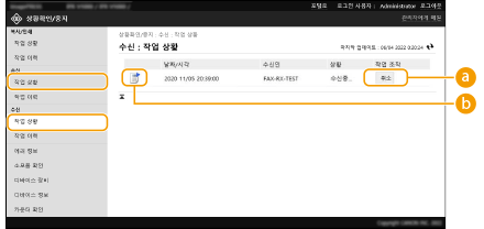 전송 대기중인 팩스 및 이메일, 수신된 I-팩스, 전송 대기중인 I-팩스의 상태를 확인할 수 있습니다. 문서 전송 및 수신 작업의 취소도 가능합니다.