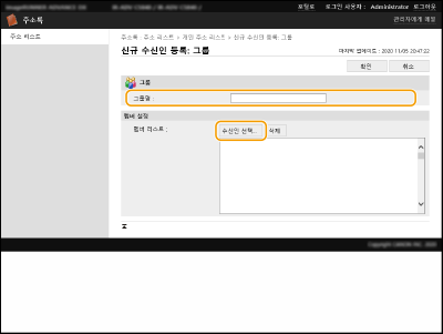 1 | 수신인을 등록할 주소 목록을 클릭합니다([개인 주소 리스트], 사용자 그룹 주소 목록, [주소 리스트 01] ~ [주소 리스트 10] 또는 [관리자용 주소 리스트]). [개인 주소 리스트]는 로그인한 사용자만 사용할 수 있으며 개인 인증 관리가 활성화 됐을 때만 사용이 가능합니다. [관리자용 주소 리스트]는 관리자 또는 장치 관리자 권한으로 로그인한 사용자만 사용할 수 있습니다. PIN 입력 페이지가 표시되면 PIN 입력 후 [확인]을 클릭합니다. 등록된 사용자 그룹과 수신인을 공유하려면 등록된 사용자 그룹 주소 목록을 선택합니다. ![]() 또한 관리자 권한이 있는 사용자만 리모트 UI에서 수신인을 등록/편집할 수 있도록 허용하여 사용자 그룹 주소 목록을 관리할 수 있습니다. <사용자 그룹 주소 리스트를 사용> |
