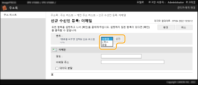 4 | 필요한 정보를 등록하고 [확인]을 클릭합니다. 표시되는 항목은 수신인 유형에 따라 달라집니다. 등록할 정보에 대한 자세한 정보는 주소록에 수신인 등록을 참고하십시오. |