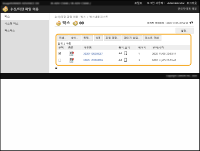 ![]() | 리모트 UI를 사용하여 메일함에 저장된 파일 및 I-팩스 받은 편지함에 임시 저장된 I-팩스의 인쇄, 전송 또는 삭제 작업을 할 수 있습니다. |