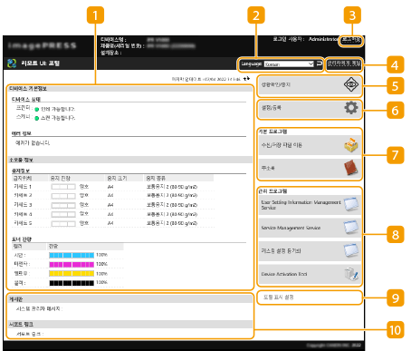 일부 표시 항목 및 기능은 관리자 권한으로 로그인한 경우에만 사용이 가능합니다. 여러 사용자가 리모트 UI를 동시에 작동하거나 기기의 조작 패널이 리모트 UI와 동시에 작동될 경우 수행된 마지막 작업이 유효합니다. |