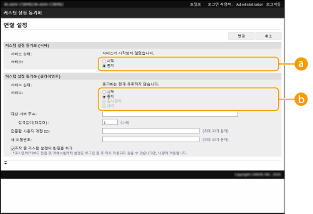 동기화 통신 로그 확인커스텀 설정 동기화 화면에서 통신 로그를 확인할 수 있습니다. 또한 로그를 파일로 다운로드할 수 있습니다. "경고" 레벨은 서버 기기가 일시적으로 통신할 수 없는 경우 기록됩니다. "에러" 레벨은 등록할 수 있는 최대 데이터 크기를 초과했거나 서버 기기와의 인증에 실패한 경우 기록됩니다. 간단한 동기화 설정동일한 라우터 내의 Canon 복합기 제어판에서 커스텀 설정 동기화를 시작할 수 있습니다. 서버 기기의 경우: (설정/등록) <관리설정> <디바이스 관리>를 누르고 <커스텀 설정 동기화 (서버)>를 <시작>으로 설정합니다.클라이언트 기기의 경우: (설정/등록) <관리설정> <디바이스 관리>를 누르고 <커스텀 설정 동기화 (클라이언트)>를 <시작>으로 설정합니다.기기를 서버/클라이언트 기기로 사용하는 경우에도 <커스텀 설정 동기화 (클라이언트)>를 <시작>으로 설정합니다. 사용자 인증을 인증 방법으로 활성화해야 합니다. 동기화 취소 시 참고 사항클라이언트 기기가 커스텀 설정 동기화를 취소하면 클라이언트 기기가 서버 기기에 등록된 각 사용자의 설정을 검색할 수 없습니다. 따라서 클라이언트 기기였던 기기의 개인화 데이터는 커스텀 설정 동기화를 취소한 후 최신 데이터가 아닐 수 있습니다. |