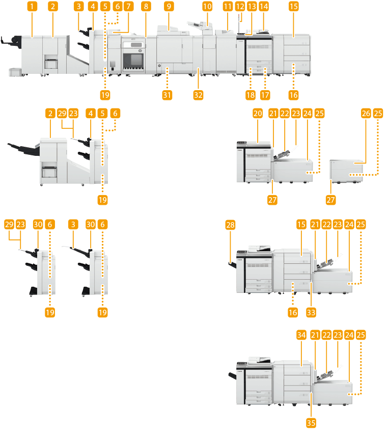 "Perfect Binder-F"에는 책 제본, 풀칠, 재단 및 쌓기 기능이 장착되어 있습니다. 자세한 내용은 "Perfect Binder-F" 설명서를 참조하십시오.