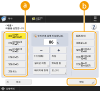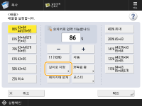 <자동 XY독립>을 지정한 경우 <용지선택>에서 용지를 선택합니다. 용지 크기를 지정하지 않는 경우 용지 카세트 1에 넣은 용지에 맞추어 복사 비율이 자동으로 설정됩니다.