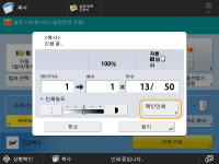 <확인인쇄>는 소트, 시프트 또는 스테이플 모드에서 여러 매의 복사를 하는 동안 나타납니다. "Staple Finisher-AG", "Booklet Finisher-AG" 또는 "High Capacity Stacker-J"가 부착되면 <확인인쇄>를 사용할 수 있습니다. |