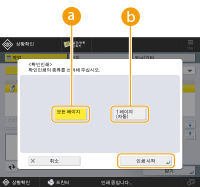 오류를 무시하고 인쇄를 계속하려면 <상세정보>를 누르고 문서를 선택한 다음 <에러스킵>을 누르면 됩니다.기기에 있는 모든 인쇄되지 않은 작업을 강제로 인쇄하려면 <상세정보>를 누르고 문서를 선택한 다음 <배출>을 누르십시오.끼어들기 인쇄 작업은 다른 작업으로 끼어들 수 없습니다. 끼어들기 인쇄 작업을 끼어들려고 하면 현재 끼어들기 작업이 완료된 후에 작업이 시작됩니다. |