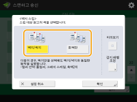 <백지 스킵>이 설정되면 <이메일> 또는 <파일> 유형 수신인만 지정됩니다. <이메일> 또는 <파일> 이외의 유형의 수신인이 설정되면 전송을 수행할 수 없습니다. 원본 크기가 스캔 크기 설정보다 작으면 올바로 건너뛰지 못할 수 있습니다. |