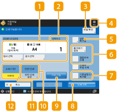 인쇄할 용지 크기와 인쇄 매수와 같은 설정 상태를 표시합니다. 제대로 인쇄하려면 설정을 꼭 확인해야 합니다. 설정을 변경하려면 표시 영역 아래의 버튼을 누르십시오. 인쇄 매수를 변경하려면, 숫자 키로 매수를 입력하십시오.