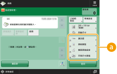 基本功能畫面上的設定項目數和要顯示的位置會視功能而不同。 如果將 <未分配> 設為快速鍵,快速鍵按鈕不會顯示。 您可在 <選項> 註冊的快速鍵數量限制如下。 影印 (基本):5 影印 (快速):6 掃描並傳送:2 |