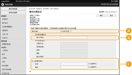 若要還原備份資料,本機的儲存裝置需要有足夠的可用空間儲存備份資料。 如果有一台以上的外接式儲存裝置連接至本機,則無法備份或還原資料。請中斷任何不必要的外接式儲存裝置連接,保持只連接一個儲存裝置的狀態。 備份或還原儲存資料可能需要花費一些時間。請先等到備份或還原程序完成再關閉本機,否則有可能造成本機故障。 儲存裝置發生問題時,資料可能遺失。請定期備份/匯出機密資料。請注意,Canon 不對因資料遺失所導致的任何損害負責。 |