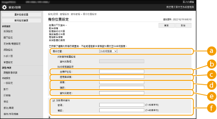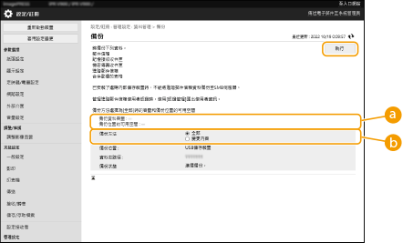 請勿變更或刪除備份資料,如此可能會使得您無法正確還原資料。 透過控制面板或遠端使用者介面操作本機時,請勿執行備份。 |
