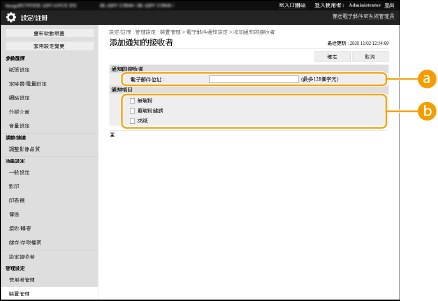 當碳粉需要更換或發生必須清除卡紙等狀況時,您可向事先指定的電子郵件位址發出通知。
