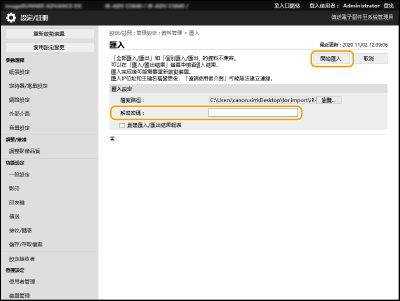 在 [解密密碼] 中,輸入的密碼要和在匯出設定資料所輸入的密碼相同。