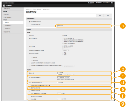 透過遠端使用者介面註冊/編輯使用者時,勾選核取方塊可自動配置部門識別碼。如果已配置部門識別碼,則不會配置新的部門識別碼。只能從遠端使用者介面指定此設定。
