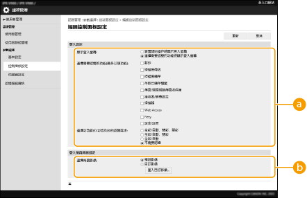 [工作接收時自動註冊] | 勾選該核取方塊可使用從電腦列印時收到的保留列印工作使用者資訊自動註冊使用者。 |