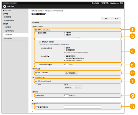![]() | 若要將Active Directory/LDAP伺服器/Microsoft Entra ID指定作為其他認證裝置,您必須要註冊用於認證的伺服器資訊。如有必要請執行測試。 |