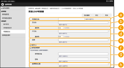 3 | 輸入 LDAP 伺服器資訊。 ![]() [伺服器名稱]輸入 LDAP 伺服器名稱。不能使用「localhost」名稱。伺服器名稱可以包含空格。 [主位址]輸入 LDAP 伺服器的 IP 位址和主機名稱(範例:ldap.example.com)。不能使用回送位址 (127.0.0.1)。 [連接埠:]輸入與 LDAP 伺服器通訊使用的連接埠號。請使用在伺服器上的相同設定。如果您沒有輸入數字,當勾選了 [使用TLS] 時會自動設定為「636」,如果未勾選,則會設定為「389」。 [次位址:] / [連接埠:]在您的環境中有使用備用伺服器時,請輸入 IP 位址和連接埠號。 [註解]如有必要,輸入說明或註記。 [使用TLS]與 LDAP 伺服器的通訊使用 TLS 加密時,請勾選此核取方塊。 [使用認證資訊]僅在 LDAP 伺服器設定為允許匿名存取時,才取消勾選會以允許對 LDAP 伺服器的匿名存取。使用使用者名稱和密碼進行認證時,請勾選此核取方塊並輸入 [使用者名稱:] 和 [密碼:] 的值。 ![]() 如果勾選此核取方塊,當您想要變更LDAP伺服器的<主位址>或<次位址>中的設定時,需要在<使用認證資訊>的<密碼:>中輸入指定的密碼。 [搜尋開始位置:]執行 LDAP 伺服器認證時,指定要搜尋使用者資訊的位置(層級)。 |