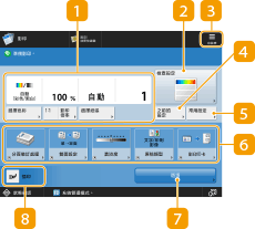 顯示影印倍率、紙張尺寸和份數等設定狀態。請務必確認設定值,以確保影印正常進行。若要變更設定,請按下顯示區域下方的按鈕。