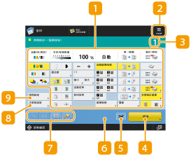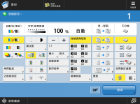 顯示影印倍率、紙張尺寸、份數等設定狀態。請務必確認此處的設定,以確保影印正常進行。若要變更設定,請按下顯示區域下方的按鈕。