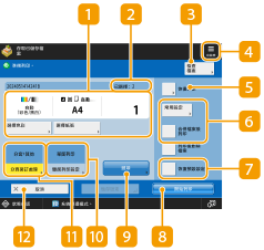 顯示例如要列印的紙張尺寸和列印份數等設定狀態。請務必確認設定以便可正確列印。若要變更設定,請按顯示區域下方的按鈕。若要變更列印份數,請使用數字鍵輸入數量。