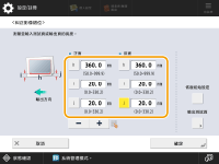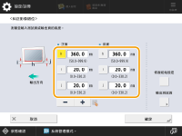 返回 <糾正影像錯位> 畫面,輸入正面和反面 <i> 和 <j> 的測量長度 (對於長型紙張:<h>、<i> 和 <j> 的測量長度)。使用下列兩個數值和「h = 360.0」(對於長型紙張:「h = 360.0/450.0/550.0/650.0」表示最靠近紙張末端邊緣的 [h]),讓裝置進行調整,如此列印區域和紙張可能會變得平行。
