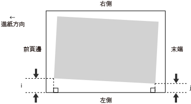如果列印影像歪斜,您可以對齊「i」的邊距 (亦即從紙張左頁邊到列印區域的距離) 和「j」的邊距來糾正未對齊的影像。