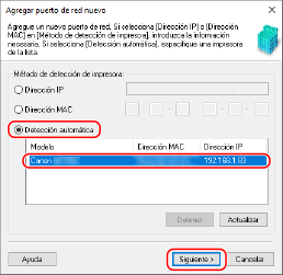Seleccione [Detección automática] y la máquina, y haga clic en [Siguiente].