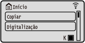 (Tecla Início) no painel de controle. Por padrão, a tela [Início] é exibida após a energia ser ligada, logo após o fechamento da tela de inicialização. Tela [Início]Modelo de painel de operação ![]() | Modelo LCD com 5 linhas ![]() |
