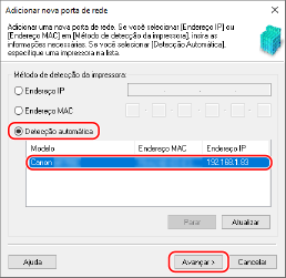 Se a máquina não for exibida, clique em [Atualizar] Se a máquina ainda não for exibida, selecione [Endereço IP] ou [Endereço MAC], digite o endereço IP ou endereço MAC da máquina e clique em [Avançar].
