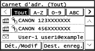 Lorsque vous détectez le carnet d'adresses à partir de l'écran [Accueil] et que vous sélectionnez une adresse de destination, l'écran de numérisation ou de fax s'affiche avec l'adresse sélectionnée spécifiée.