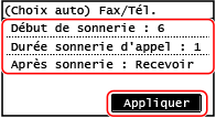 Sélectionnez la durée de la sonnerie et l'action à exécuter en réponse à la réception d'un fax, puis appuyez sur [Appliquer].