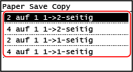 | | Wenn Sie bei mehreren Originalen Papier sparen möchten, verwenden Sie die Funktion Paper Save Copy. Sie können N auf 1-Kopieren und doppelseitiges Kopieren gleichzeitig über den Bildschirm [Startseite] oder über  auf dem Bedienfeld durchführen, sodass Sie Papier sparen können. |