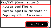Impostare il tempo di squillo e l’operazione da eseguire quando si riceve un fax, quindi premere [Applica].