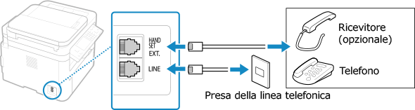 Collegare un ricevitore opzionale o un telefono alla presa ricevitore (HAND SET)/presa telefono esterno (EXT.) sulla macchina.