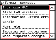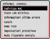 Oltre all'indirizzo MAC e alle informazioni di connessione della LAN wireless, quando la macchina è connessa a una LAN wireless, è possibile vedere anche le impostazioni di sicurezza.