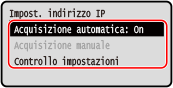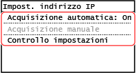 2 | Configurare l’impostazione di Auto Acquisizione, secondo necessità. [Selezione protocollo] Di norma, impostato su [DHCP]. Tuttavia, quando [DHCP] viene impostato in un ambiente in cui non è possibile usare DHCP, la macchina continuerà a confermare l’Auto Acquisizione in rete, creando una comunicazione non necessaria. Quando non si usa DHCP, impostare l’opzione su [Off]. [IP automatico] Di norma, impostato su [On]. Sebbene venga data priorità all’indirizzo IP assegnato con DHCP, se non vi è alcuna risposta da DHCP, verrà utilizzato l’Auto IP. |