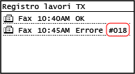 Se la stampa non può essere eseguita, oppure dati scansionati o un fax non possono essere inviati o ricevuti, oppure si verifica un altro errore, viene visualizzato un codice errore (numero a tre cifre che inizia con "#") nel report o nel registro lavori.