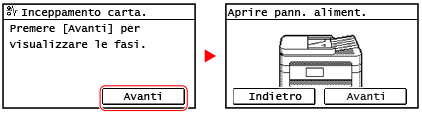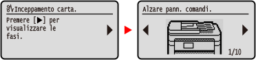 Non rimuovere con forza il foglio inceppato dalla macchina.La rimozione forzata della carta può comportare lesioni personali o danneggiare i componenti della macchina. Se non è possibile rimuovere la carta, rivolgersi al proprio rivenditore o rappresentante dell'assistenza. Se il problema persiste Quando tutti i fogli bloccati nella macchina sono stati rimossiAllontanare immediatamente le mani dalla macchina per evitare che le mani o i vestiti rimangano impigliati nei rulli. |