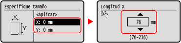 3 | Introduzca los valores en [Y] del mismo modo que en [X]. Cuando se registren tamaños de papel no estándar utilizados frecuentemente, el tamaño registrado se mostrará como tamaño del papel. Registro de papel de tamaño no estándar (tamaño personalizado) |
