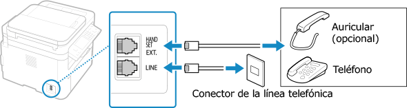 Conecte el cable telefónico suministrado a la toma de la línea telefónica (LINE) del equipo y al conector de la línea telefónica de la pared.