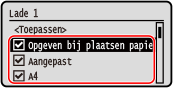 Het scherm met papierinstellingen toont de geregistreerde veelgebruikte papierformaten. Als ongebruikte papierformaten worden weergegeven, kunt u deze verbergen voor iedere papierbron, zodat het selecteren van een papierformaat makkelijker gaat.