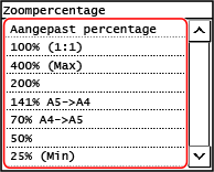 Selecteer een vaste kopieerverhouding uit de lijst of selecteer [Aangepast percentage] en voer een aangepaste verhouding in met de nummertoetsen.