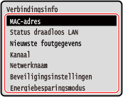 Naast het MAC-adres en verbindingsinformatie van het draadloos LAN (als het apparaat is aangesloten op het draadloos LAN) kunt u ook de beveiligingsinstellingen bekijken.