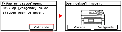 Trek het vastgelopen papier niet hardhandig uit het apparaat.Hierdoor kunnen mensen letsel oplopen of kunnen inwendige onderdelen van het apparaat beschadigd raken. Als u het papier niet kunt verwijderen, neem dan contact op met de dealer of servicemonteur. Als het probleem aanwezig blijft Als alle papierstoringen zijn verholpenHaal direct uw handen uit het apparaat, zodat uw kleren en handen niet bekneld raken tussen de rollen. |
