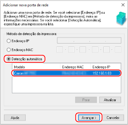 Se a máquina não for apresentada, clique em [Atualizar]. Se a máquina continuar a não ser apresentada, selecione [Endereço IP] ou [Endereço MAC], introduza o endereço IP ou o endereço MAC da máquina e clique em [Seguinte].
