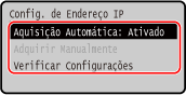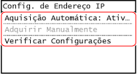 Normalmente, está definida para [DHCP]. No entanto, quando [DHCP] é definido num ambiente onde não é possível utilizar DHCP, a máquina vai continuar a confirmar a Aquisição Automática na rede, criando comunicações desnecessárias. Quando não utilizar DHCP, defina para [Desativado].