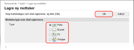 Redigere eller slette registrerte mottakereHvis du velger en mottaker og klikker på [Rediger] på skjermbildet i trinn 4, kan du redigere den registrerte informasjonen. For trinn 4 klikker du [Slett] til høyre for mottakeren du ønsker å slette, og mottakeren vil bli slettet. |