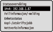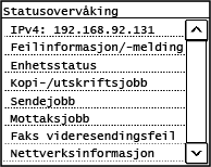 på kontrollpanelet. Bruk dette skjermbildet til å sjekke informasjonen for maskinen, bruk og logger, nettverksinnstillinger og feilinformasjon. Skjermbildet [Statusovervåking]Modell med berøringspanel ![]() | Modell med LCD-skjerm med 5 linjer ![]() |