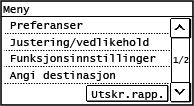 Endre skjermbildeDu kan endre visningen på kontrollpanelet som for eksempel ved å endre språk og måleenheter, eller vise og skjule meldinger. [Displayinnstillinger] Du kan invertere fargene på skjermen og justere kontrasten slik at det er lettere å se på skjermen. [Tilgjengelighet] Slette innstillinger automatiskSom standard vil innstillingene som konfigureres på skjermen bli slettet hvis det ikke utføres noen handlinger etter et bestemt tidsrom, og skjermbildet [Hjem] vises. Du kan endre tidsrommet før innstillingene slettes og skjermbildet vises. [Auto-nullstillingstid] [Funksjon etter auto-nullstilling] |