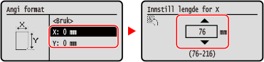 3 | Angi verdiene i [Y], på samme måte som [X]. Hvis ofte brukte ikke-standard papirformater er registrert, vises det lagrede formatet som papirformatet. Registrere papir med annet format enn standard (egendefinert format) |